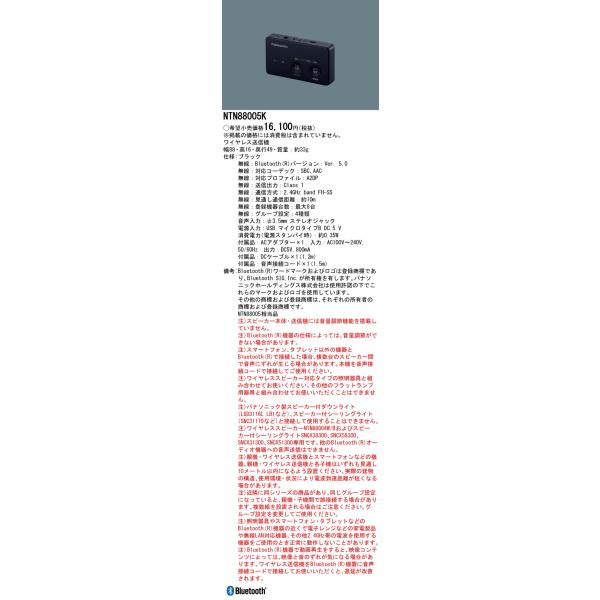 - ※返品について パナソニック ワイヤレススピーカー用 ワイヤレス送信機 NTN88005K 無線グループは4つまで設定でき、隣接環境でも混在を防止。 無線接続グループを設定でき、誤接続を防止します。 ※異なるグループのスピーカー同士は2m程度離してください。 【ご注意】 ワイヤレススピーカー対応タイプの照明器具と組み合わせてお使いください。 ※その他仕様についてはメーカーホームページをご確認の上ご注文ください。 ※本製品はワイヤレススピーカー専用オプションのため単品でのご使用はできません。 製品仕様・注意事項 【ワイヤレス送信機】 ◆無線:Bluetooth(R)バージョン:Ver. 5.0 ◆無線:対応コーデック:SBC、AAC ◆無線:対応プロファイル:A2DP ◆無線:送信出力:Class 1 ◆無線:通信方式:2.4GHz band FH-SS ◆無線:見通し通信距離:約10m ◆無線:登録機器台数:最大8台 ◆無線:グループ設定:4種類 ◆音声入力:φ3.5mm ステレオジャック ◆電源入力:USBマイクロタイプB DC5V ◆消費電力(電源スタンバイ時):約0.3W ◆付属品:ACアダプター×1 入力:AC100V~240V,50/60Hz 出力:DC5V,800mA ◆付属品:DCケーブル×1(1.2m) ◆付属品:音声接続コード×1(1.5m) ◆メーカー保証:1年間 ■Bluetooth(R)ワードマークおよびロゴは登録商標であり、Bluetooth SIG,Inc.が所有権を有します。パナソニック株式会社は使用許諾の下でこれらのマークおよびロゴを使用しています。その他の商標および登録商標は、それぞれの所有者の商標および登録商標です。 ※ワイヤレススピーカー対応タイプの照明器具と組み合わせてお使いください。既発売のフラットランプ用器具と組み合わせてお使いいただくことはできません。 ※パナソニック製スピーカー付ダウンライト(LGD3116L LB1など)、スピーカー付シーリングライト(SNC31170など)と接続して使用することはできません。 ※ワイヤレススピーカーNTN88004W/B専用です。他のBluetooth(R)機器への音声送信はできません。 ※照明器具やスマートフォン・タブレットなどのBluetooth(R)機器の近くで電子レンジなどの家電製品や無線LAN対応機器、その他2.4GHz帯の電波を使用する機器をご使用のとき正常に動作しないことがあります。 ※スピーカー本体・送信機には音量調節機能を搭載していません。 ※Bluetooth(R)機器の仕様によっては、音量調節ができない場合があります。 ※スマートフォン、タブレット以外の機器とBluetooth(R)で接続した場合、複数台のスピーカー間で音声にズレが生じる場合があります。ワイヤレス送信機NTN88005Kを音声接続コードで接続してご使用ください。 ※Bluetooth(R)機器で動画再生をすると、映像コンテンツによっては、映像と音のずれが気になる場合があります。ワイヤレス送信機をBluetooth(R)機器に音声接続コードで接続してお使いいただくと、遅延が改善されます。