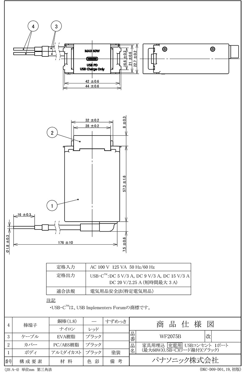 パナソニック 埋込USB Power Deliveryコンセント TypeC(組替式) リード線付 1個モジュール 入力100V AC 出力USB-TypeC 最大60W ブラック WF2075B