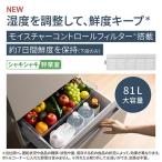 - コンパクトなキッチンにもすっきり収まる、本体奥行60cm。・奥行うす型だから、作業スペースにもゆとりがうまれる。キッチン空間になじむ、フラットドアでシンプルなデザイン。・落ち着いた質感のマットカラーが空間に調和する。約7日間、野菜を新鮮に保存できるシャキシャキ野菜室(下段のみ)。(★当社調べ。運転状況や食品の種類・状態や量、保存する前の食品の状況によって、効果が異なります。ボトルコーナーに入れた野菜は含みません。★)(※冷蔵庫外気温度25℃。扉開閉なし。野菜をラップなしで満載に保存。保存日数や鮮度は、野菜の種類や冷蔵庫に入れるまでの状態により変わります。※)・81Lの大容量で、新鮮野菜をたっぷり収納。