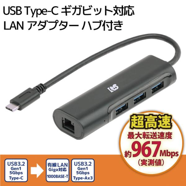 USB Type-C LANアダプター ギガビット対応 USBハブ付き RS-UCLAN-H3A USB LAN 変換 USB Type-C ハブ LAN 変換アダプター
