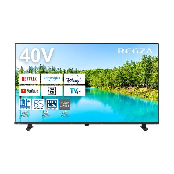 - リサイクル回収をご希望の場合店頭にお持ちいただくかコールセンターにご依頼ください。リサイクル回収には指定のリサイクル料・収集運搬料及び訪問回収料を頂戴いたします。※アンテナケーブルは付属しておりませんREGZA 40V35N 40インチ フルハイビジョン液晶テレビ レグザ V35Nシリーズ 40インチ発売日:2024年2月16日●ざんまいスマートネット動画も放送番組も、好きなタレントの出演番組がすぐに見つかるネット動画も放送番組も、好きなタレントの出演番組がすぐに見つかる●ネット動画今話題のさまざまなネット動画が楽しめる●Apple AirPlay 2、スクリーンミラーリングモバイルデバイスのコンテンツを、レグザの大画面で楽しめる●クリア音声人の声をより聞き取りやすく●瞬速ゲームモード高速のレスポンスでゲームをより快適に 【仕様】パネル方式:フルHD液晶パネル画素数(水平×垂直):1920×1080画面寸法:幅 87.8cm,高さ 48.5cm,対角 100.3cm外形寸法(スタンド付き):幅 90.0 cm,高さ 54.5 cm,奥行 18.6 cm質量(スタンド含む/本体のみ):6.0 kg/5.9 kg梱包箱寸法:幅 100.8 cm,高さ 61.5 cm,奥行 12.9 cm梱包時質量:9.5 kg定格動作時(リモコン待機時/機能動作時):83W(0.4W/9W)年間消費電力量(省エネ基準達成率):69kWh/年(118%)省エネラベリング 2026年度目標省エネ達成率118%年間消費電力69kWh/年年間電気代目安1860円/年