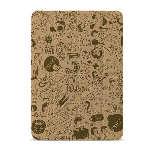 人々の様々なリラックス方法を図案化して、フロントカバーにデザインした個性的なスリムフォリオケース。