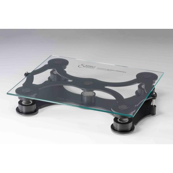 - RELAXA 830 イタリア発 RELAXA史上最強の800シリーズ イタリアのESSECI DESIGN(エッセチ・デザイン)がリリースしたRELAXA 830 / 850は、長年SAPブランドでRELAXAシリーズの開発を行ってきたSilvano Cremonesi(シルヴァーノ・クレモネージ)が自らのブランドから発信する高性能マグネット・フローティング・システムです。素材構成を一新しメカニカル精度を飛躍的に高めた800シリーズ。その洗練されたビジュアル・デザインは、アカデミア・ディ・ベレ・アルティ・ディ・ヴェローナ"Accademia di Belle Arti di Verona"のアカデミック・ワーキング・グループによってデザインされています。振動から解放されたオーディオ・プロダクトがそのポテンシャルを全開にする未体験ゾーンを是非体感してみてください。RELAXA 800シリーズはイタリア国内でハンドメイド製造されています。 RELAXA 800 シリーズについて 強化ガラス、スチール、アルミニウムなど、異種素材による振動コントロールと剛性のために38のコンポーネントで組上げられたRELAXA800シリーズ。フローティング精度向上のため、新素材のガイドスルーを採用。ガイドピンのスムーズな上下運動を可能にしています。 浮遊エンジンである強力なネオジウム・マグネットは、磁気シールド効果のあるアルミケース内に収められ、オーディオ・コンポーネントの水平調整はベース部のアルミ製シリンダーを回転させるだけの簡単調整を実現しています。5組のマグネット・シリンダーを持つ830が30kg、850は8組のマグネット・シリンダーにより50kgの荷重をフローティングします。 RELAXA 800シリーズのビジュアル・デザインについて RELAXA 800シリーズの有機的なビジュアルは、国際的なアーティストである「カルラ・フラッチ(Carla Fracci)」に世界的な評価を与えたことでも有名なアカデミア・ディ・ベレ・アルティ・ディ・ヴェローナ"Accademia di Belle Arti di Verona"のアカデミック・ワーキング・グループによってデザインされました。 仕様 本体サイズ:W480×D360×H83 mm ※H=ガイドピン高 ガラスボードサイズ:W430×D360 mm 重量:9.0kg