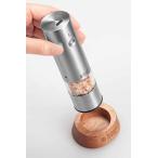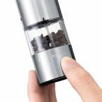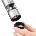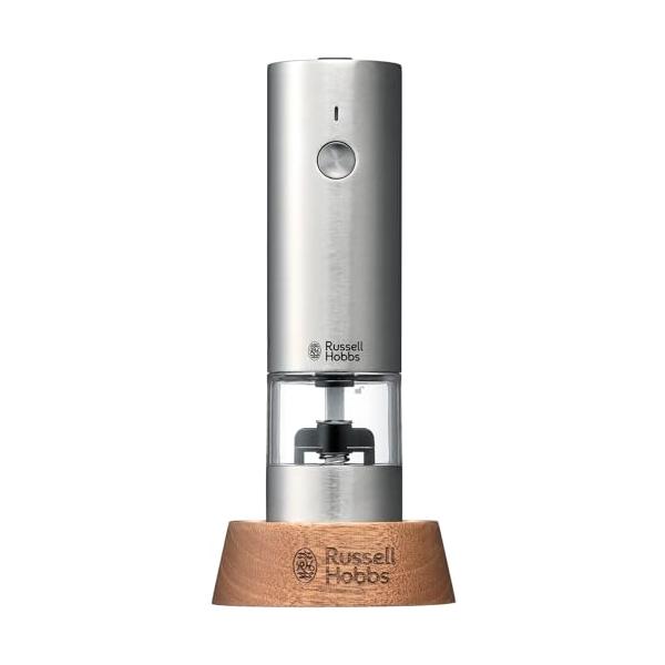 - 【商品説明】更に軽量でコンパクトになった、充電式のテーブルミル。電池が不要なので、長期的にはコストダウンにもなります。スマートなデザインは、テーブルに置くだけで、食卓をスタイリッシュに演出してくれます。■ダイニングテーブルの便利アイテムハンディサイズでコンパクトなため、スペースをとりません。料理の最後の仕上げにも、食事中の一足しにも便利なアイテムです。シルバーのステンレス質感は清潔感ある印象を与えてくれ、家庭の食卓がカフェのように、こなれたオシャレ感が演出できます。■片手でワンプッシュミル上部のボタンを押すと、電動で挽くことができます。片手で操作できるサイズ感で、食材を混ぜたり炒めたりする手を休めずに使用することができます。■電池を使わない充電式バッテリーはUSB充電式なので、交換用電池の補充や廃棄のストレスが無く使い続けることができます。■残量が見やすい透明なキャビンキャビンに入る容量が従来の7933JPよりも約2割アップしました。(※)キャビン部は透明なので、残量が一目で分かります。また、広めの充填口により、塩や胡椒が充填しやすくなりました。※メーカー調べ。内容物によって多少の充填量が変わります。■汚れを防ぐミルキャップグラインダー部に残る細かな胡椒や塩がテーブルなどに散って汚れないよう、ミルにはキャップが付いているので、持ち運びや収納に便利です。■ミルの転倒を防ぐウッドスタンドこのウッドスタンドにミルを立てることによって、ミルの転倒を防ぎます。ステンレスとウッドの組み合わせは、一層高級感が増して見え、インテリアに映えます。■岩塩にも使えるセラミック刃錆の心配がなく、岩塩にも使用できる丈夫なセラミック製の刃を採用。また、摩擦熱が生じにくいため、熱で飛びやすい胡椒の香りを保ちます。■好みの挽き加減に調整できるキャビン下のダイヤルで、粗いものから細かいものまで、好みに合わせた挽き加減を調節することができます。【仕様】電源:リチウムポリマー電池 3.7V/300mAhサイズ:約W4.0×D4.0×H14.0cm(スタンドセット / W7.0×D6.0×H15.0cm)重量:約180g(スタンドセット / 約210g)材質:ステンレス、セラミック、PCTG 樹脂、ABS 樹脂フル充電時間:約1時間充電用USBケーブルの長さ:約0.7m付属品:充電用USB ケーブル(Type-C)、キャップ、スタンド、ブラシ生産国:中国【送料について】北海道、沖縄、離島は送料を頂きます。ラッセルホブス 電動ミル ソルト&ペッパーミニサイズ 充電式/ウッドスタンド付ミニサイズ/ウッドスタンド付レギュラーサイズレギュラーサイズ/ウッドスタンド付
