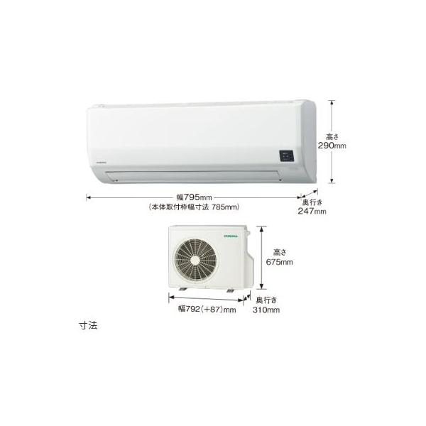 - ご注文確認後、当店より「*設置環境入力のお願い*」メールを送信いたします。メール記載のURLより、設置環境、配送希望日などの設問に必ずご回答ください。※設置環境により追加料金が発生する場合がございます。※離島や山間部等、一部地域につきましては、設置・工事などできない地域がございます。エリア外の場合はキャンセルとさせていただきます。エアコン標準工事内容・料金について家電リサイクルご希望の場合は、メールでご案内する「設置環境情報入力ページ」よりお申し込みください。※家電リサイクル料金、リサイクル回収費用が追加で発生します。リサイクル料金と収集運搬料金について※発送手配は、メールでご案内する「設置環境情報入力ページ」の設問ご回答後となりますので、必ずご回答ください。※設置工事をご希望にならない場合は、「設置環境情報入力ページ」にて「配送のみ」をご選択ください。※代金引換でのご注文は承れません。長期保証をご希望のお客様は下記の表より「商品+長期保証」のページへ移動してご注文ください。CSHWK5623R2W電源:単相200V 15Aコンセント形状:タンデム適用畳数 暖房:15〜18畳(24〜30m2) 冷房:15〜23畳(25〜39m2)能力 暖房:6.7kW(0.7〜9kW) 冷房:5.6kW(0.7〜5.7kW)消費電力 暖房:1960W(150〜2970W) 冷房:2060W(155〜2100W)期間消費電力量:2118kWh(JIS C9612:2013)省エネ基準達成率:100%:目標年度 2010年通年エネルギー消費効率(APF):5(JIS C9612:2013)機能 フィルター自動掃除:- 除菌:- 空気清浄:○ 換気:- 除湿:○ 加湿・保湿:- 人感センサー:-運転音 暖房 室内機:67db(JIS C9612:2013) 室外機:67db(JIS C9612:2013) 冷房 室内機:67db(JIS C9612:2013) 室外機:67db(JIS C9612:2013)最大配管長:15m最大高低差:10m寸法・重量 室内機寸法:幅 795×高さ 290×奥行 247mm 室内機質量:約10.5kg 室外機寸法:幅 792×高さ 675×奥行 310mm 室外機質量:約43.5kg付属品:ノンストップ暖房。除霜運転中もあたたかさが途切れない