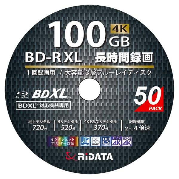BD-R XL ブルーレイディスク 100GB 50枚 RiDATA 1回録画用 片面3層 地デジ720分 2-4倍速 ワイドプリンタブル 50枚スピンドル BD-R520PW4X.50SPA ◆宅