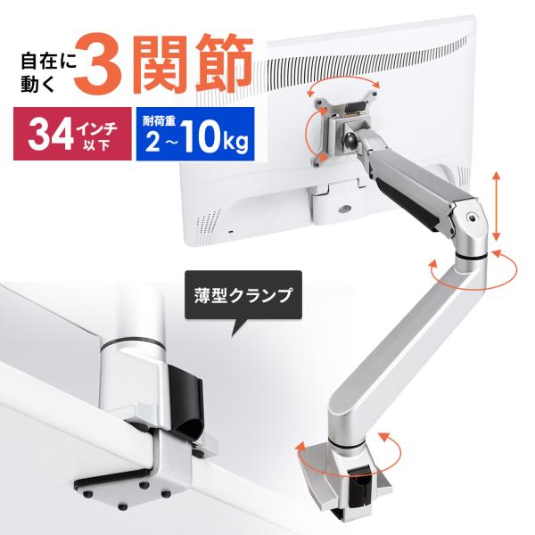 モニターアーム ガス圧 ガススプリング シルバー 銀 34インチ対応 ディスプレイアーム モニタースタンド クランプ式 サンワダイレクト 1画面 シングル 100-LA018