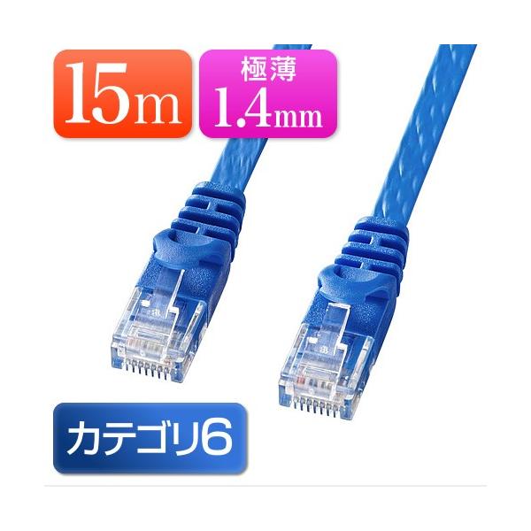 薄さ1.4mmの超フラットタイプのカテゴリ6LANケーブル。カーペットの下や細い隙間の配線に最適。15m・ブルー。