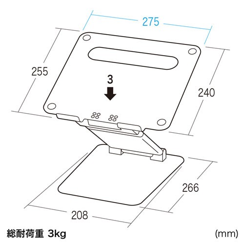 - 本体色:シルバー 材質:アルミ 外形寸法:幅275×奥行368×高さ33mm 製品重量:1.65kg 総耐荷重:3kg 付属品: 梱包:1個口(305×295×70mm / 1.92kg) 出荷形態:組立出荷 特徴:・ノートパソコンを見やすい高さ・角度に調節できるスタンディング対応アルミ製スタンドです。 ・POSレジ用の端末など、タブレット機器の設置も可能です。 ・キーボードを接続して、デスクトップパソコンのようにして使用することができます。 ・卓上で高さを上げると、スタンディングで使用できる高さにすることができます。 (昇降範囲350mm) ・コンパクトに折りたためて、持ち運びもできます。 ※角度調整は表記されている角度よりも大きい範囲で調整できますが、ご使用の際に転倒の 恐れがありますので、寸法図に表記された範囲の角度で調整し、ご使用ください。ご注文・配送に関しての注意事項 ■メーカーからの直送品のため、代引きでの対応ができない商品です。 ■軒先渡しの商品のため到着後、お客様で設置していただく必要があります。 ■運送会社の指定及び時間指定等は行えませんので予めご了承願います。 ■取り寄せ商品のため、お客様都合でのキャンセル・返品・交換は致しかねます。 ご注文時に商品仕様等をご確認のうえ、お間違いの無いよう注文お願い致します。 ■在庫切れや納期が予定より延びた場合によるキャンセルは承っております。