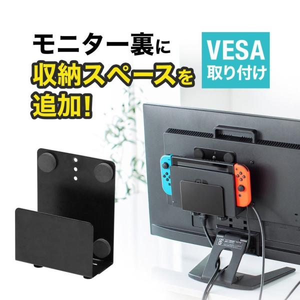 モニターや液晶ディスプレイの背面にある、VESAのネジ穴に取り付け可能なVESAホルダー。HDDやノートパソコン、ドッキングステーションやNintendo Swtichの設置などが可能な、背面収納ホルダー。【WEB限定商品】
