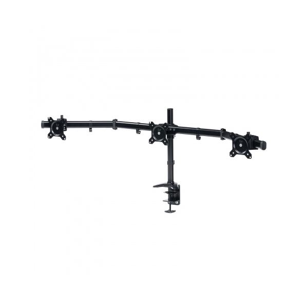 - マルチ画面に最適な3画面横並びのモニターアーム。※箱にキズ、汚れがありますが商品は新品です。<特長>●3台のモニターを横並びに設置できるモニターアームです。●横並びで3つのディスプレイを並べて設置できるので、作業効率が格段に上がります。●VESA規格(75×75mm、100×100mm)に準拠した液晶ディスプレイの取り付けが可能です。●最大8kg(モニター1台あたり)までの液晶モニターの取り付けに対応しています。●液晶アームを使うことで、モニターの台座を必要としない分広々とデスク上を使用できます。●デスクの天板へ取り付け可能なクランプタイプです。●ディスプレイからのケーブルをすっきり配線できるケーブルクリップ付きです。<仕様>■カラー:ブラック■出荷形態:ノックダウン組立式(お客様組み立て)■梱包:1個口/825×260×148mm・約7kg■取り付け方法:クランプ■クランプ可能厚:10〜60mm■材質:マウント/スチール、アルミアーム/スチール、プラスチックブラケット/スチール■画面数:3台■総耐荷重:24kg■可動範囲/液晶モニター:【パン(画面左右)】左45度/右45度【チルト(画面上下)】上15度/下15度【スウィング(全体左右)】左側手前35度/右側手前35度【ローテーション(画面回転)】360度■支柱直径サイズ:32mm■セット内容:左アーム、センターアーム、右アーム、支柱、ストッパー、ケーブルホルダーA、ケーブルホルダーB×4、アーム用スペーサー×4、ナット×4、ボルト(M8×55)×2、六角レンチ(3mm)、六角レンチ(4mm)、六角レンチ(5mm)、ディスプレイ取り付け用ボルトセット、組立説明書■付属ディスプレイ取り付け用ボルトセット:M4×12、M4×30、スペーサー(16.5mm) ※各12個■付属スペーサーサイズ:16.5mm■保証期間:初期不良のみ■対応機種:VESA75×75、100×100に対応する8kg以下のモニター、VESA対応金具など■対応ディスプレイ:サイズ(最大)/27インチ重量(最大)/8kg■対応VESA:75×75、100×100■VESAブラケット:幅/115mm厚/2mm<関連キーワード>モニターアーム 3画面 27インチ対応 左右 クランプ固定 多関節 CR-LAC312BK 4969887197639ラインナップ ※訳あり 新品3画面4画面