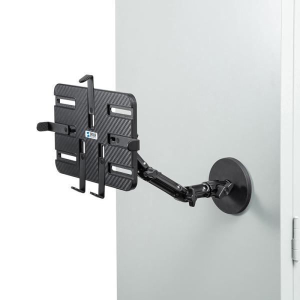 工事車両やスチール製ラックなどに取り付けできる強力マグネット式タブレットホルダー。4関節タイプ。