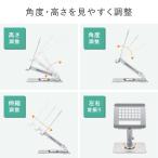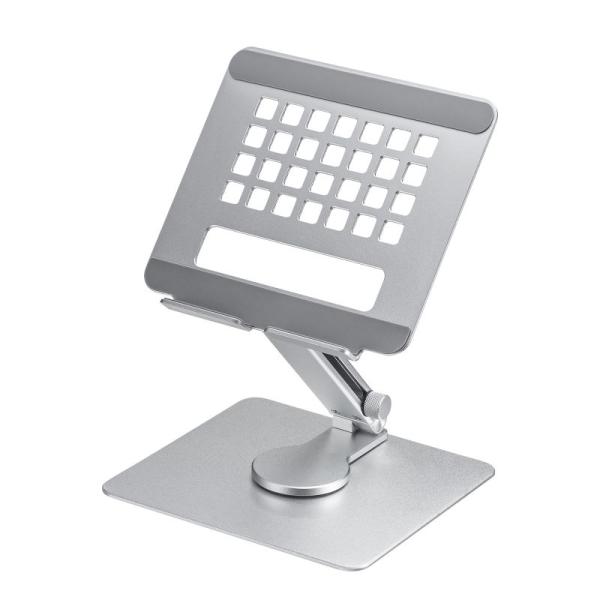 - 【特長】●伸縮アームにより高さの調整ができるアルミ製のタブレット用デスクトップスタンドです。●ヒンジ構造により無段階で自由に角度と高さを調整することができるので、使用環境に合わせて最適な角度で使用できます。●アーム部分が360度回転するので、他の人と簡単に画面を共有することができます。●折りたたんでコンパクトにできるので、省スペースに収納可能です。●充電コネクタホール付きで充電ケーブルを接続したままタブレットをスタンドに設置できます。●設置機器が触れる部分には擦り傷から保護するキズ防止ゴムパッド付きです。●丈夫で安定感のあるアルミ素材のスタンドと底面にある滑り止めラバーで、操作時でもしっかり安定します。●タブレットはタテ置き、ヨコ置きどちらの設置にも対応しています。●アルマイト処理された上質な質感のアルミ製でインテリアになじみ、様々なデバイスにマッチします。【仕様】■サイズ:約W170×D157×H51mm■重量:約540g■材質:アルミニウム、シリコーンゴム■機器固定方法:置き型■耐荷重:1kg■角度調節:対応■高さ調整:0〜+75mm
