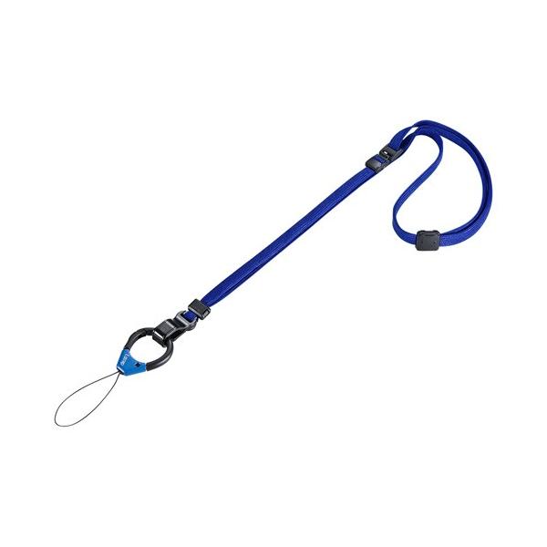 - 指を通して落下を防止するフィンガーストラップが先端についた、便利なネックストラップ。ブルー