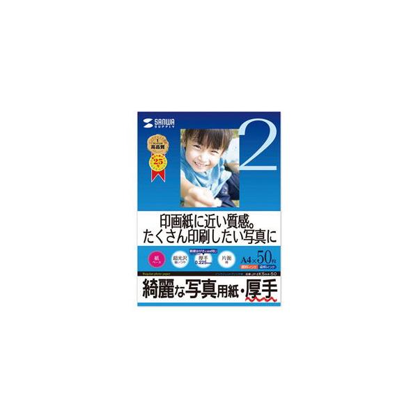 - “印画紙に近い質感。たくさん印刷したい写真に最適な厚手の写真用紙。”片面印刷用、つやつやの写真用紙、超光沢紙:厚手。(A4サイズ・50枚)■ 強い光沢感があり白色度も高いので、写真をより美しく再現。紙ベースながら写真印画紙に迫る美しい仕上がりです。■ 0.225mmとしっかりした厚みがあるので、メニューやポスターなどしっかりした厚さの欲しい写真の印刷に最適です。■ 手軽な印刷に便利です。友達に配りたいとき、旅行やイベントのときなど、たくさん印刷したいときにおすすめです。※エプソンPM-4000PX、PX-5600、PX-G・A・Vシリーズなどの全色顔料系インクを使用したプリンタにも対応します。ただし、黒など濃度の高い色のベタ部分で油状の光沢感が出ることがあります。※用紙の表面はすぐ乾きますが、用紙内部のインクの十分な乾燥には時間がかかります。※キヤノン・hp・NEC製プリンタの顔料系黒インクには対応しませんので、「普通紙設定」で印刷しないでください。印刷時の用紙設定にはご注意ください。 サンワサプライ JP-EK5A450 (インクジェット写真用紙 厚手/A4サイズ・50枚) (JPEK5A450)