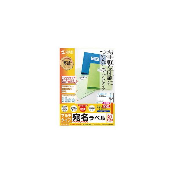- いろいろなプリンタで使えるマルチタイプのつやなしマットラベル。余白付21面・100シート入り。LB-EM16N-1 サンワサプライ※箱にキズ、汚れがありますが商品は新品です。<特長>●プリンタを選ばず、マルチに使えるラベル。インクジェットプリンタ、カラー・モノクロレーザー、カラー・モノクロコピーなどで利用できます。※インクジェットプリンタで写真画像中心の印刷には向きません。●つやなしマットタイプのラベルで、文字やイラストなどのお手軽な印刷におすすめです。はがれにくい強粘着タイプです。●粘着剤の剥離力を重く設定しているので、熱のかかるレーザープリンタの中でラベルが剥がれにくくなっています。また、レーザープリンタの中で熱がかかっても糊がはみ出しにくく、ドラムを汚しにくい設計です。●宛名ラベルや分類・表示ラベルに最適な横長サイズです。<ご注意>※ラベルに対応していないカラー・モノクロレーザープリンタでは使用できません。 ※カラー・モノクロレーザープリンタには、印刷可能な用紙・ラベルの坪量(138g/平方メートル以下など)があります。対応可能な坪量かどうかご確認の上、ご利用ください。 ※トナーの良好な定着のためには、印刷時に適切な用紙設定が必要です。<仕様>■シートサイズ:A4(210×297mm)■ラベルサイズ:63.5×38.1mm■面付:21面付■入数:100シート、2100ラベル入り■重量:134g/平方メートル■厚み:0.152mm(ラベルのみ0.085mm) ■白色度:92±3%■メーカー保証:なし■対応プリンタ・インクジェットプリンタ※顔料インクにも対応します。※ただし、写真画像をきれいに印刷する用途には向きません。・カラー・モノクロレーザープリンタ※プリンタによって印刷可能な用紙の厚さ・坪量が異なります。詳しくは各プリンタの取扱説明書をご覧ください。・カラー・モノクロコピー・熱転写プリンタ(インクリボン使用時のみ)