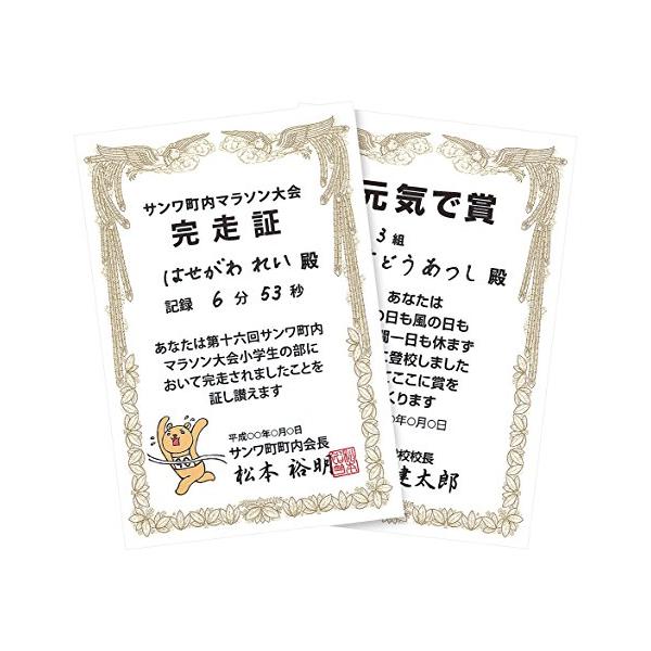 - 【返品種別A】□「返品種別」について詳しくはこちら□2016年02月 発売はがきサイズのオリジナル賞状が必要な数だけ簡単・きれいに作れる用紙◆オリジナルの賞状が簡単に作れる便利な用紙です。必要なときに必要な数だけ作成できます。 ◆表面には、あらかじめ豪華な賞状の枠が金色で印刷してあるので、文章を追加して印刷するだけでオリジナル賞状ができあがります。 ◆学校や幼稚園、保育園や町内会のイベントなどでのちょっとした表彰に便利です。■ 仕 様 ■対応機種:インクジェットプリンタ(染料/顔料)サイズ:はがきサイズ(100×148mm)入数:20枚重量:186.1g/平方メートル厚み:0.202±0.01mm種類:縦型白色度:88%[JPSHHKTN]OAサプライ/OA機器>用紙>手作りキット>その他