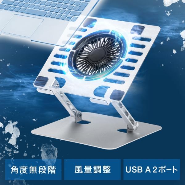 ノートパソコンクーラー スタンド 静音 無段階 角度調節 高さ調整 アルミ製 冷却台 15.6インチ対応 USB給電 大型ファン 卓上 折りたたみ 400-CLN033 サンワサプライ