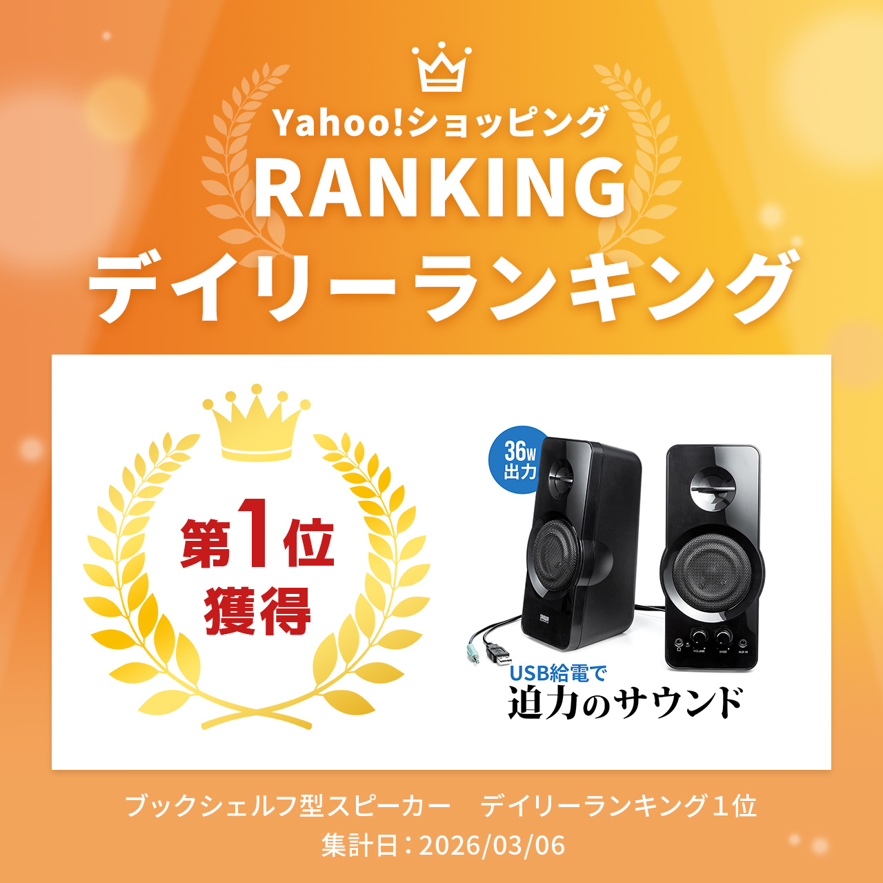 - 商品詳細USB給電ながら最大36Wの高出力に対応できる、PCスピーカー。『PRAC(Power Reserving Amplifier Circuit)回路』を搭載し、パソコンスピーカーの他、スマートフォン用スピーカー、テレビ用スピーカーとしても使用可能。ヘッドフォンジャックも搭載し、ヘッドフォンも接続できるステレオ2chスピーカー。仕様■製品サイズ:約W98×D97×H208mm■重量:約1.04kg■実用最大出力:36W(18W+18W)■周波数特性:20Hzから20KHz■スピーカー形式:バスレフ式フルレンジスピーカシステム■スピーカーサイズ:3.0インチ(直径約78mm)■インピーダンス:4オーム■入力端子:USB Aコネクタオス(USB3.1/2.0/1.1規格対応)■電源:USBポートより供給(DC5V 500mA以上)■筐体材質:ABS、HIPS■ケーブル長:スピーカー間ケーブル約1.05m、PC接続USBケーブル約1.5m■生産地:中国■保証期間:購入日より6ヶ月■取説説明書:日本語取扱説明書あり対応機種■対応機種:3.5mmステレオミニプラグが接続が可能、パソコン、テレビ、スマートフォン、タブレット表示された検索窓に商品番号を入力してください【 商品番号:400-SP082 】【2019年2月登録】関連キーワード:サンワサプライ 4969887572757表示された検索窓に商品番号を入力してください【 商品番号:400-SP082 】⇒こちらの商品のレビューを、もっと読みたい方はこちら一緒にいかがですか100-VESA008購入はこちら100-SPSTN01購入はこちら100-SPSTN02購入はこちら
