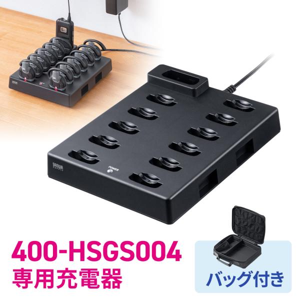 ワイヤレスガイドシステム(400-HSGS004T/R)用の専用充電器。ケーブル接続不要で、セットするだけで充電できる充電ステーション。親機1台、子機11台の最大12台をまとめて充電できる充電台。【WEB限定商品】