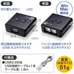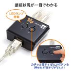 - パソコン2台をボタン押しの手動での切替が出来るUSB切替器。手のひらサイズのコンパクトで、WindowsとMacの両対応。USBケーブル 1本付き。<特長>●2台のパソコンで1台のUSB機器を共有できるUSB切替器です。●ボタン一つで簡単に切り替えることができます。●複数のパソコンでプリンタやマウス・キーボード、外付けハードディスクの共有に便利です。※バスパワー仕様の外付けハードディスクやスキャナー等の消費電力が大きい機器を接続する場合は、 電力不足により動作が不安定になる場合があります。※マウスやキーボード等、すべての動作を保証するものではありません。●現在接続されているパソコンがわかるLEDランプ付きで、接続状況がひと目でわかります。●ボタンを押すとカチッと音がするので、ボタンを押せたかが分かりやすくなっています。●コンパクトなのでデスクスペースを圧迫しません。【ご注意】※USB2.0の環境内で本製品を使用した際にUSB2.0の規定内速度で動作することを弊社内で検証しています。※USB2.0の規格には切替え、ケーブルの延長という概念がないため、特に規定がありません。※本製品はUSB2.0の規格に準拠していますが、USB IFの認証を取ったものではありません。※USB2.0・USB1.1いずれの場合でもUSB機器や環境の差、USBケーブルの品質の差によっては正常に動作しない場合があります。<仕様>■カラー:ブラック■サイズ:W60.6×D60.6×H22mm■重量:51g■インターフェース:USB仕様 Ver.2.0準拠(USB仕様 Ver.1.1上位互換)■コネクタ:USB Aコネクタ メス ×1(周辺機器側)USB Bコネクタ メス ×2(パソコン側)■切替内容:パソコン2:周辺機器1■環境条件(結露なきこと):動作時温度/0から40℃保管時温度/0から60℃■付属品:USB2.0対応USB接続ケーブル(1.8m) ×1■生産国:中国■保証期間:ご購入日より6ヶ月■取扱説明書:あり<対応機種>■対応機種:Windows搭載(DOS/V)パソコン、Apple Macシリーズ※USBポートを装備し、1つ以上の空きがあること。■対応OS:Windows11・10・8.1・8・7・Vista・XP(32/64bit、各Edition対応)Mac OS X(10.0〜10.11)、Mac OS 9.0以降<関連キーワード>400-SW020 サンワサプライラインナップ2:1切替器4:1切替器2:1切替器(キーボードエミュレーション機能)