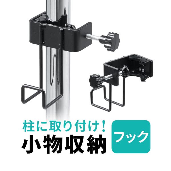 支柱やポールに取り付け設置できる、クランプ式フック 。テレビスタンドの支柱や台車のフレームに取り付け可能。ケーブルやアクセサリ収納に最適。耐荷重1kg。ブラック。【WEB限定商品】