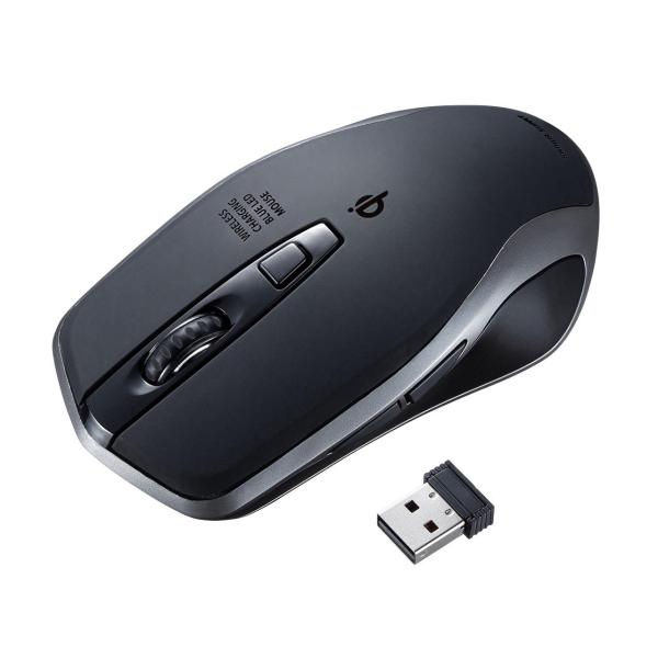 - 置くだけ充電。ワイヤレス充電式ワイヤレスブルーLEDマウス。Qiと専用ケーブルで充電できる充電式ワイヤレスマウス 赤色の光学式より感度の高い青色LEDを搭載し光沢感のあるデスク面でもマウスパッドなしでスムーズな操作が可能です。↓※鏡など光を反射する素材や、ガラスなど透明な素材の上でご使用になると、カーソルがスムーズに動かない場合があります。↓また規則正しいパターンの上ではトラッキング能力が低下する場合があります。 マウスポインタを動かさず、手元のサイドボタンにも「戻る・進む」の2ボタンを搭載しており、Webブラウザで操作をスピーディに行えます。↓※Apple Macシリーズでは使用できません。 用途に合わせてカーソルスピードを800・1200・1600カウントに切り替えることができます。カウント切り替えボタンを押すだけのスピード簡単切り替えです。 ノートパソコンに差したままで、持ち運びや保管ができる小型レシーバーです。 ケーブルを気にせず使えるワイヤレスタイプです。 電波障害に強い2.4GHzデジタル帯で、通信範囲が半径10mの広範囲で安定したデータ通信が可能です。↓※電波干渉のない場合に限る↓※透明ガラスなどの一部の表面では動作しにくい場合があります。 レシーバーはマウス本体裏面に差し込むだけの簡単収納です。 不使用時の電池消耗を防止する電源ON・OFFスイッチ付き。↓↓●インターフェース:USB HID仕様バージョン1.1準拠 ※USB3.1/3.0/2.0インターフェースでも使用できます。 ●コネクタ形状:USBコネクタ(Aタイプ) ●ワイヤレス方式:2.4GHz RF電波方式 ※マウスとレシーバー間のIDは固定です。 ●通信範囲:木製机(非磁性体)/半径約10m スチール机(磁性体)/半径約2m ●分解能:800・1200・1600カウント/インチ ●読み取り方式:光学センサー方式(ブルーLED) ●ボタン:2ボタン、2サイドボタン、ホイール(スクロール)ボタン、カウント切替ボタン ●電池性能:連続作動時間/約60時間 連続待機時間/約2160時間 使用可能日数/約150日 ※1日8時間パソコンを使用中に、マウス操作を5%程度行う場合。(新品の単3アルカリ電池使用時) ※サンワサプライ社内テスト値であり、保証値ではありません。 ※使用期間により、徐々に性能が低下します。予めご了承下さい。 ●サイズ・重量:マウス/約W69×D121×H38mm・約105g(電池含まず) レシーバー/W14.5×D18.5×H6mm・約2g ●付属品:レシーバー×1、充電用ケーブル×1本、取扱説明書