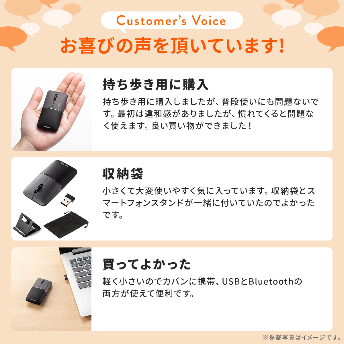 - 商品詳細超小型のモバイルマウスSLIMO。充電ケーブルが内蔵されており、別途ケーブルを持ち歩き不要。Bluetoothと2.4GHzワイヤレスの両対応。持ち運びに便利なポーチ付き。スリムで超軽量。仕様■カラー:ブラック(400-MAWBT194BK)・ネイビー(400-MAWBT194NV)【共通仕様】■サイズ:約W44.9×D85.6×H24.2mm■重量:約42g(バッテリーを含む)■レシーバー重量:約2g■接続方式:Bluetooth・2.4GHzワイヤレス■読み取り方式:光学センサー方式(ブルーLED)■通信範囲:木製机(非磁性体)/半径約10m、スチール机(磁性体)/半径約2m※電波の通信範囲は使用環境によって異なります。■ボタン:左、右クリック、ホイールボタン■分解能:1200count/inch■電池タイプ:内蔵バッテリー■充電ケーブル形状:USB Type-Cコネクタ オス■レシーバー収納:あり■連続動作時間:約36時間■連続待機時間:約4000時間■使用可能日数:約18日※1日8時間パソコンを使用中に、マウス操作を5%程度行う場合。(満充電時)※自然放電等を考慮しない弊社計算値であり保証値ではありません。■生産地:中国■取扱説明書:日本語取扱説明書あり■保証期間:ご購入日より1年【Bluetooth仕様】■電波周波数:2.402GHzから2.480GHz■適合規格:Bluetooth Ver.5.0(BLE) Class2■プロファイル:HOGP (HID over GATT Profile)【2.4GHzワイヤレス仕様】■インターフェース:USB HID Ver.1.1準拠※USB 10Gbps/5Gbps/2.0インターフェースでもご使用になれます。■コネクタ形状:USB Aコネクタ■ワイヤレス方式:2.4GHz RF電波方式※マウスとレシーバー間のIDは固定です。対応機種■対応OS:Windows11・ 10、macOS(Sonoma) 14、macOS(Ventura) 13、macOS(Monterey) 12、macOS(BigSur) 11 iPadOS 17から14、iOS 17から14、Android13から11、ChromeOS■対応機種:Bluetooth HIDプロファイル対応、またはUSB Aポートを搭載するWindows搭載パソコン・タブレット、Apple Macシリーズ ・iPad・iPhone、Chrome OS搭載パソコン、Androidタブレット・スマートフォン※電波の通信範囲は使用環境によって異なります。※機種により対応できないものもあります。※記載されている名称・製品名は、各社の商標または登録商標です。表示された検索窓に商品番号を入力してください【 商品番号:400-MAWBT194 】【2024年05月登録】関連キーワード:女性 静音マウス サイレントマウス かわいい コンパクト 小型 薄型 充電式 ★iphone15周辺機器★ ★iphone15plus周辺機器★ ★iphone15pro周辺機器★ ★iphone15promax周辺機器★ ★iphone14周辺★ ★iphone14plus周辺★ ★iphone14pro周辺★ ★iphone14promax周辺★ ★iphonese3周辺★ ★iphone13周辺★ ★iphone13mini周辺★ ★iphone13pro周辺★ ★iphone13promax周辺★ ★iphone12周辺機器★ ★iphone12mini周辺機器★ ★iphone12promax周辺機器★ ★iphone12pro周辺機器★ ★iphoneSE2周辺機器★ ★iphone11周辺機器★ ★iphone11pro周辺機器★ ★iphone11promax周辺機器★ 無線マウス ワイヤレス コードレス ワイヤレス無線 パソコン PC Windows Mac プレゼント ギフト 大人 男性 彼氏 bluetooth ブルートゥース ブルーツース 女性 かわいい コンパクト 小型 静か クリック音が小さい 寝室 図書館 オフィス 会議室 公共施設 病院 新幹線 USB接続 サンワサプライ 4969887701560 4969887701577表示された検索窓に商品番号を入力してください【 商品番号:400-MAWBT194 】⇒こちらの商品のレビューを、もっと読みたい方はこちら
