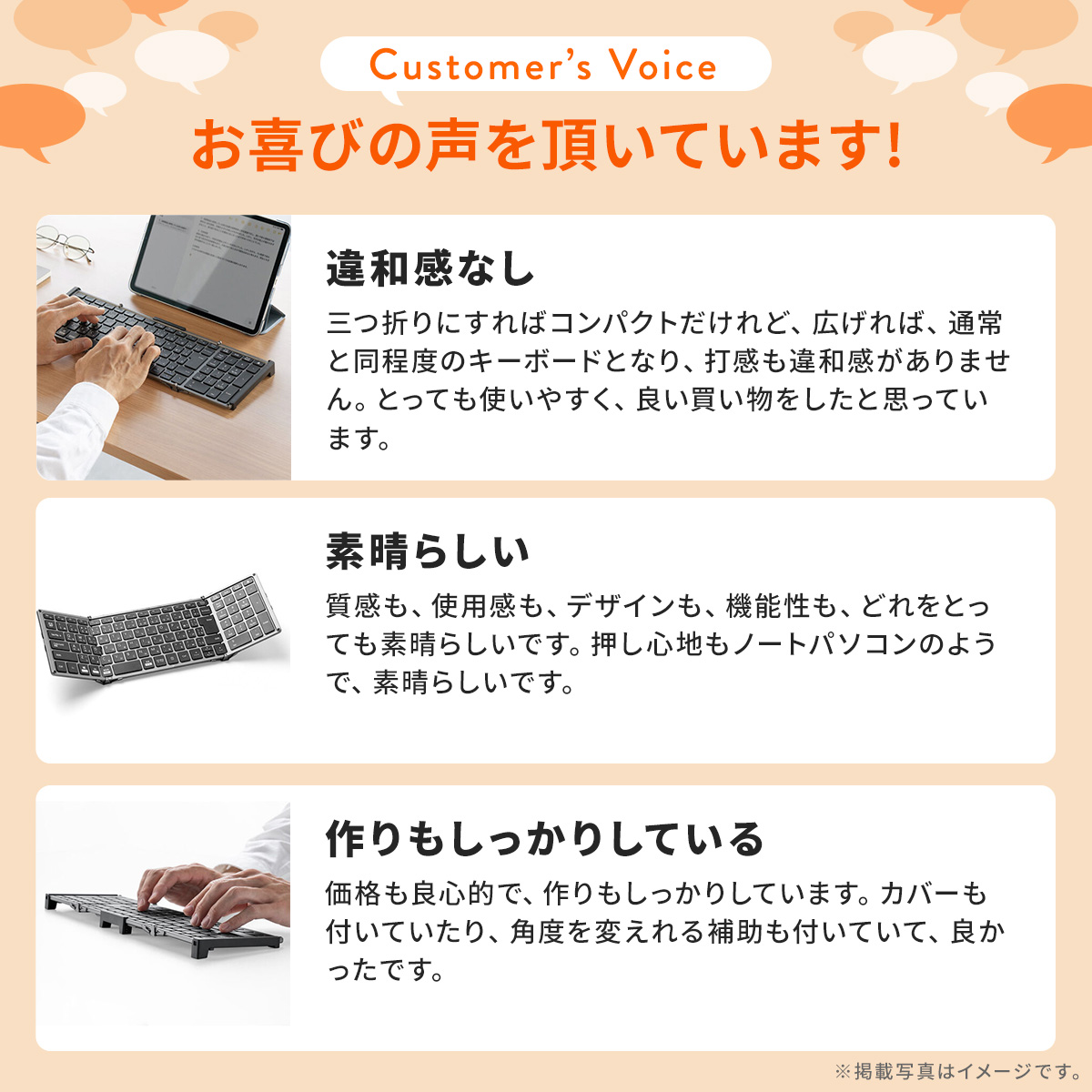 - 商品詳細持ち運びに便利な折りたたみ式Bluetoothキーボード。最大2台接続できるマルチペアリング対応し、有線接続を含めると最大3台の機器を切り替えできます。繰り返し充電して使えるリチウムイオン電池を内蔵。スタンド付き。仕様■サイズ:約W37×D12×H1.3cm(広げた時)、約W20.6×D12×H1.6cm(畳んだ時)■重量:約350g【キーボード仕様】■キー配列:日本語■キースイッチ:パンタグラフ■キー数・キーピッチ:104キー・19mm■キーストローク:1.6±0.2mm■動作力:60±20g■バッテリー寿命:連続使用時間約50時間■充電時間:2時間■使用電池:リチウムイオン電池■付属品:USBケーブル(約80cm)■生産地:中国■保証期間:ご購入日より6ヶ月■取扱説明書:日本語取扱説明書あり【Bluetooth仕様】■ワイヤレス方式:Bluetooth Ver 5.1 Class2■通信距離:最大約10m(使用環境により異なります)■送信出力:Class 2■プロファイル:HID【ご注意】※使用時間は弊社社内のテスト値であり、保証値ではありません。※自動車のダッシュボードや窓際などの直射日光の当たる場所での保管や、火の近く・高温・多湿の場所での使用、ならび蓄電、保管はしないでください。事故、故障の原因になります。対応機種■対応機種:Bluetoothモジュール内蔵のWindowsパソコン、Apple Macシリーズ、Androidスマートフォン・タブレット、iPhone・iPadシリーズ■対応OS:Windows 11・10・8.1・8macOS(Sonoma) 14、macOS(Ventura)13・macOS(Monterey) 12・macOS(BigSur) 11、macOS 10.12から10.15Android 8から14※有線接続は非対応。iOS 11から17※有線接続は非対応。iPadOS 13から17※有線接続は非対応。表示された検索窓に商品番号を入力してください【 商品番号:400-SKB080 】【2024年07月登録】関連キーワード:★ipadpro11m4周辺機器★ ★ipadpro13m4周辺機器★ ★ipadminia17pro周辺機器★ ★iphone15周辺機器★ ★iphone15plus周辺機器★ ★iphone15pro周辺機器★ ★iphone15promax周辺機器★ ★iphone14周辺★ ★iphone14plus周辺★ ★iphone14pro周辺★ ★iphone14promax周辺★ ★iphonese3周辺★ ★iphone13周辺★ ★iphone13mini周辺★ ★iphone13pro周辺★ ★iphone13promax周辺★ ★iphone12周辺機器★ ★iphone12mini周辺機器★ ★iphone12promax周辺機器★ ★iphone12pro周辺機器★ ★iphoneSE2周辺機器★ ★iphone11周辺機器★ ★iphone11pro周辺機器★ ★iphone11promax周辺機器★ Windows Mac 無線 コードレス ワイヤレス USB接続 無線 パソコン PC コードレス ワイヤレス プレゼント ギフト 大人 男性 彼氏 サンワサプライ 4969887702482表示された検索窓に商品番号を入力してください【 商品番号:400-SKB080 】⇒こちらの商品のレビューを、もっと読みたい方はこちら