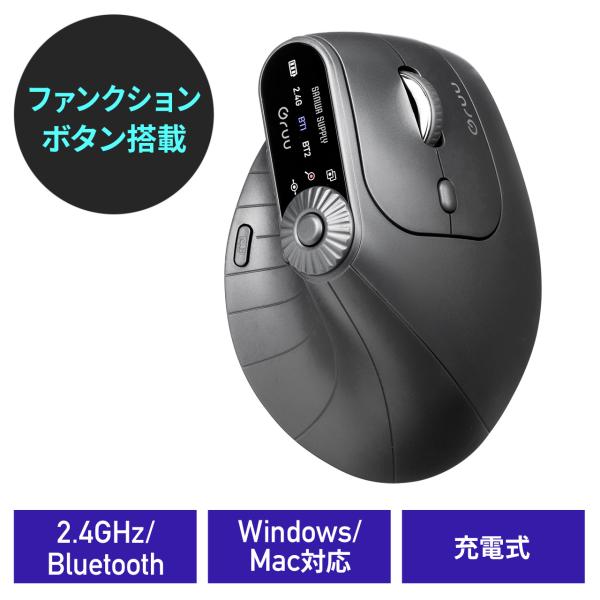 Bluetooth&2.4GHz対応の充電式ワイヤレスマウス。5ボタン+3機能で横スクロールも可能。ダイヤル操作&エルゴ形状で快適操作。Gruuシリーズのブラックモデル。