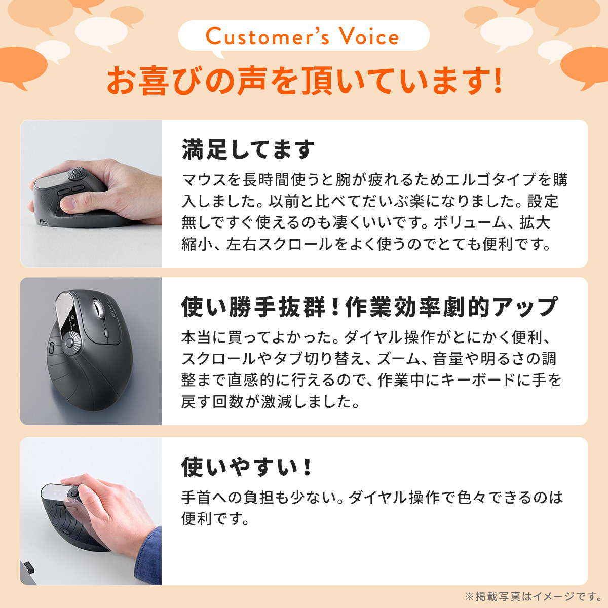 ダイヤルで6つの機能を操作できる、液晶画面付き多機能エルゴノミクスマウス。マウスの5ボタンに加え、左右スクロール、マルチウインドウ切替え、タブ切替え、ズーム操作、音量調整、画面明るさ調整がダイヤルで操作できる。マウスの液晶画面表示で、充電残量、接続モード、選択している機能、カウント数(DPI)、接続状態の5つが確認できる。充電残量が目で見て分かる。合計3台のマルチペアリングに対応し、USB Aレシーバー×1台、Bluetooth×2台の接続を切り替えて使える。付属のUSBケーブルをパソコンに接続することで有線マウスとして使えます。【WEB限定商品】