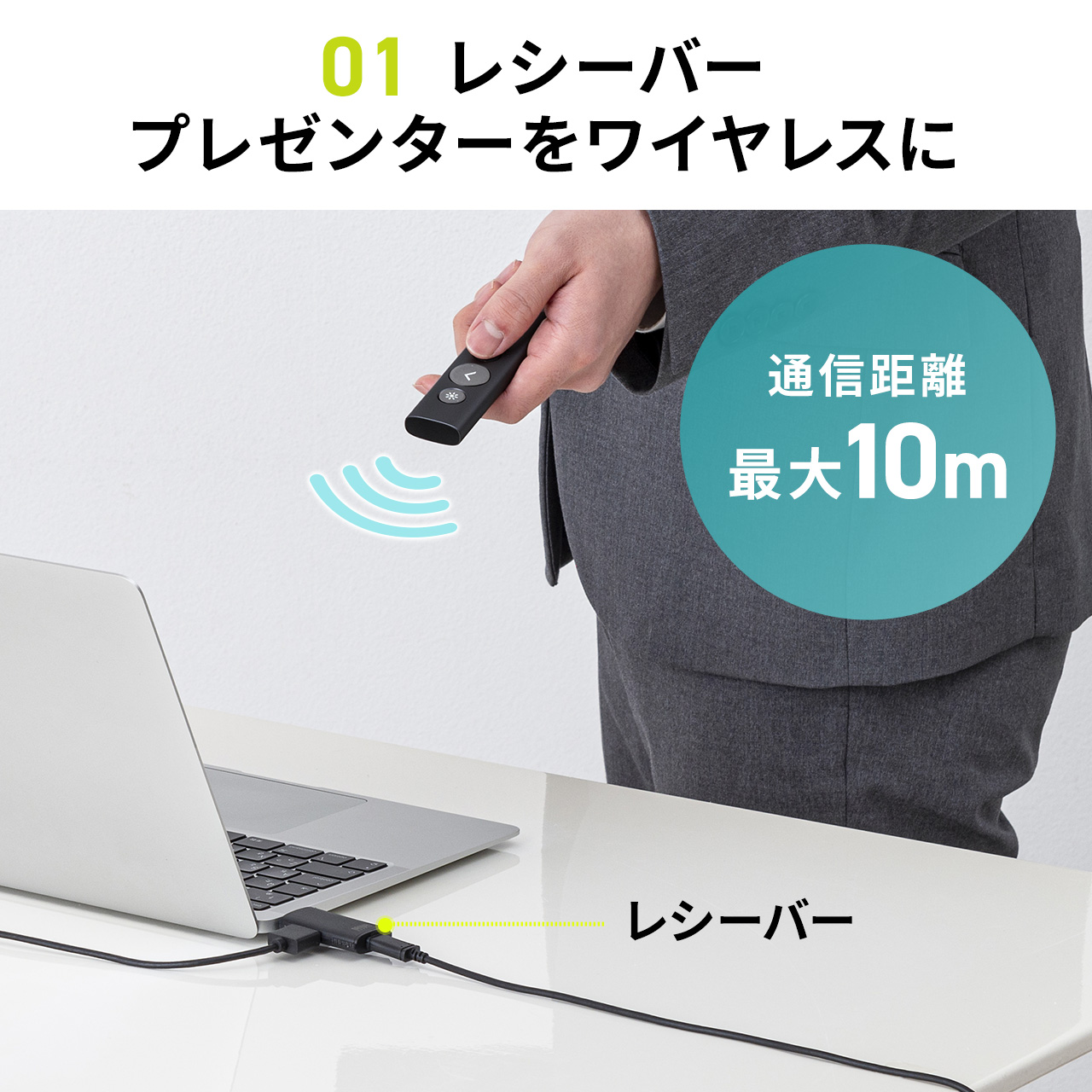 - 3-in-1多機能レシーバー付き、ワイヤレスプレゼンター。USB-C接続の3-in-1多機能レシーバーは、プレゼンターとの接続だけでなくHDMI変換アダプタ、100WまでのPD充電にも対応。シンプルなボタンで左クリックとページ送り/戻しなどに対応。既定の機能の割り当てが行え。面倒な乾電池交換が不要なUSB充電式。連続照射時間が約30時間。Windows/Mac対応。<特長>●3-in-1多機能レシーバー付き、ワイヤレスプレゼンターです。●カーソルがポインターになるデジタルレーザー/ソフトウェアポインター機能を搭載しています。 物理的にレーザーを照射せずにパソコンの画面内にポインターを表示できるので、オンライン会議での画面共有の際にもポインターが表示されます。●USB-C接続の3-in-1多機能レシーバーは、プレゼンターとの接続だけでなくHDMI変換アダプタ、100WまでのPD充電にも対応しています。 これひとつ持ち運べば、会議や出張の際にわざわざUSBハブやHDMI変換アダプタを用意する必要がありません。●直感的に操作できるシンプルなボタンです。左クリックとページ送り/戻しなどに対応します。 それぞれ2回押し、長押しにも対応しており、既定の機能の割り当てが行えます。●2つの便利なモードを搭載。ポインターボタンを2回押すことでデジタルレーザーモードとマウスモードを切り替えることができます。●デジタルレーザーモードでポインターボタンを長押しすることでパソコン画面上にポインターを表示します。本体を傾けるとポインターの移動が可能です。●面倒な乾電池交換が不要なUSB充電式です。USB-Cケーブルで充電することができます。●プレゼンの直前までパソコンのUSBポートから充電できるので、常にフル充電で備えておけます。●連続照射時間が約30時間と、物理レーザーよりも大幅に電力消費が抑えられています。●大型ボタンで直感的な操作ができ、手になじむ形状で快適な操作性です。●レシーバーは大型ですが本体に収納できるので、コンパクトに持ち運びできて便利です。●胸ポケットにも簡単に入るスリムなボディで、手軽に持ち運ぶことができます。●物理レーザーを照射しないため、誤って目にレーザーが当たる心配がありません。●名入れサービス対応品なので、ノベルティや記念品に最適です。●Windows/Macのどちらでも使えます。●HDMI変換アダプタは最大で4K/60Hzまでの映像出力に対応します。<仕様><共通仕様>■製品カラー:ブラック■製品サイズ:約W2.8×D14×H1.2cm■製品重量:約52g■充電コネクタ形状:USB Type-Cコネクタ■電源:内蔵バッテリー(リチウムイオン電池)■連続使用時間:約30時間(※弊社テスト値であり保証値ではありません。)■ボタン:4ボタン(ポインターボタン、進むボタン、戻るボタン、電源スイッチ)■セット内容: 本体、レシーバー■生産地:中国■取扱説明書:日本語取扱説明書あり■保証期間:ご購入日より6ヶ月<レシーバー仕様>■最大対応解像度:4K/60Hz■USB PD:最大100W■レシーバーコネクタ形状:USB Type-Cコネクタ■接続方式:2.4GHzワイヤレス■通信範囲:最大半径約10m※電波の通信範囲は使用環境によって異なります。■対応機種: 各社Windowsパソコン、Apple Macシリーズ、iPad、iPhone■対応OS:Windows 11・10、macOS 15・14・13・12・11、iPadOS 14〜18、iOS 17〜18■対応アプリケーション:Microsoft PowerPoint 2021以上、Microsoft PowerPoint for Mac 2021以上、Keynote 7.2以上※標準でUSB-Cポートを持つ機種。※機種により対応できないものもあります。※iPad、iPhoneはソフトウェアには対応していません。※充電用のケーブルは付属しておりません。※物理レーザーを照射しないため、PSC認証の対象となりません。※カーソルが動かない場合はポインターボタンの2回押しでモード切替えを何度かお試し下さい。<関連キーワード>ワイヤレスプレゼンター 3-in-1ハブレシーバー プレゼン ポインター USB-C充電式 HDMI変換アダプタ デジタルレーザー 無線 オンライン会議対応 200-LPP051BK サンワサプライ