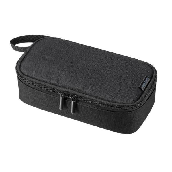 モバイルバッテリーやアダプタなどの小物をまとめてすっきり整理収納できるコンパクトポーチ。幅215×奥行115×高さ65mm。ブラック。