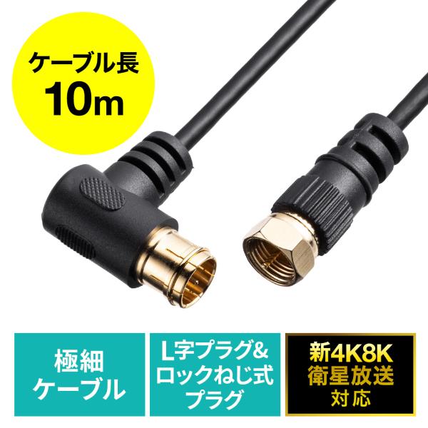 極細のアンテナケーブルで、新4K8K衛星放送対応でL字差込プラグとロックねじ式コネクタを採用。テレビ・チューナー・Blu-rayレコーダー・DVDレコーダー・ビデオデッキなどに接続する10mの黒色アンテナコード。