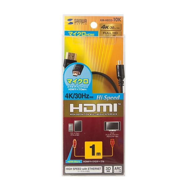 - 【商品解説】●4K/30Hz解像度対応解像度3840×2160ピクセルの映像に対応。(フルHD解像度は1920×1080)●HDMIイーサネットチャンネル(HEC)対応対応した機器と機器がイーサネット・ネットワークでつながります。●オーディオリターンチャンネル(ARC)対応テレビ側から音声信号をAVアンプなどに伝送可能。●3D映像対応対応した機器を接続することでフルHD 3D映像をお楽しみいただけます。●Deepカラー対応色深度が24ビット(フルカラー)を超え、30/36/48bitまで対応●高音質デジタル音声信号(マルチチャンネルサラウンド)対応※対応したソフトや機器が必要です【スペック】●型式:KM-HD23-10K(KMHD2310K)●JANコード:4969887766101ケーブル長:1m形状:HDMI⇔MicroHDMIタイプ:スタンダードタイプ4K/8K対応:4K対応3D対応:3D対応イーサネット対応:イーサネット対応この商品は宅配便でお届けする商品です出荷可能日から最短日時でお届けします。※出荷完了次第メールをお送りします。配送サービス提供エリアを調べることができます「エリア検索」をクリックして、表示された画面にお届け先の郵便番号7桁を入力してください。ご購入可能エリア検索お買い上げ合計3,980円以上で送料無料となります。※3,980円未満の場合は、一律550円(税込)となります。●出荷可能日から最短日時でお届けします。(日時指定は出来ません。) ※お届け時に不在だった場合は、「ご不在連絡票」が投函されます。 「ご不在連絡票」に記載された宅配業者の連絡先へ、再配達のご依頼をお願いいたします。●お届けは玄関先までとなります。●宅配便でお届けする商品をご購入の場合、不用品リサイクル回収はお受けしておりません。●全て揃い次第の出荷となりますので、2種類以上、または2個以上でのご注文の場合、出荷が遅れる場合があります。詳細はこちら■商品のお届けについて商品の到着日については、出荷完了メール内のリンク(宅配業者お荷物お問い合わせサービス)にてご確認ください。詳しいお届け目安を確認する1度の注文で複数の配送先にお届けすることは出来ません。※注文時に「複数の送付先に送る」で2箇所以上への配送先を設定した場合、すべてキャンセルとさせていただきます。