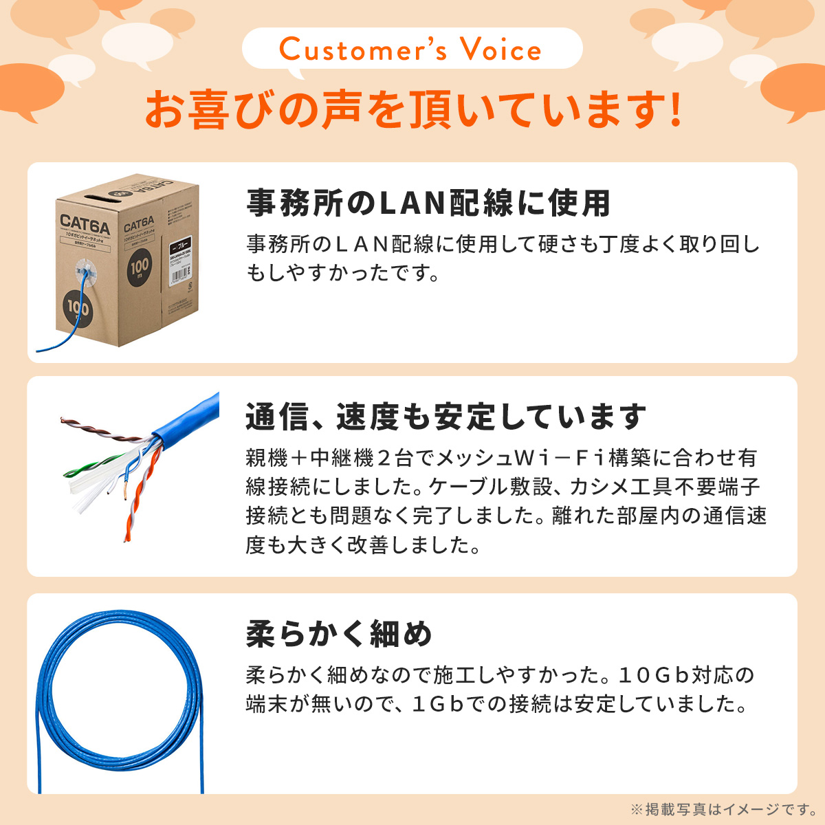 - 商品詳細自作用に最適なコストパフォーマンスに優れた巻きLANケーブル。環境に合わせた長さに作成可能。ケーブル残量が分かるレングスマーク入り。コネクタなし。仕様■ケーブル長:100m:ブルー(500-LAN6A-CB100BL)・ホワイト(500-LAN6A-CB100W)300m:ブルー(500-LAN6A-CB300BL)・ホワイト(500-LAN6A-CB300W)■ケーブル直径:5.8mm■ケーブル構造:UTP4対(8芯)、単線(AWG24)■対応伝送帯域:カテゴリ6A(10GBASE-T)、カテゴリ6(1000BASE-TX)、エンハンスドカテゴリ5(1000BASE-T)、カテゴリ5(100BASE-TX)、カテゴリ3(10BASE-T)適合■生産地:中国■保証期間:初期不良のみ■取扱説明書:なし対応機種【対応コネクタ・工具】■適合コネクタ:500-LAN-RJ6■適合かしめ工具:500-LAN-TL1、LAN-TL8、HT-500R、HT-568R■外皮むき工具:500-LAN-TL2、LAN-TL9、LAN-TL11、LAN-TL5、HT-308■適合モジュラーカバー:ADT-MC4シリーズ、ADT-MC6シリーズ■パンチダウン工具:LAN-TL1K【2023年01月登録】関連キーワード:LAN ランケーブル サンワサプライ⇒こちらの商品のレビューを、もっと読みたい方はこちら