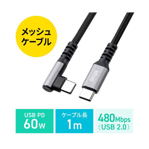 USB Type-Cケーブル L字 USB PD60W ポリエステルメッシュ 高耐久 CtoC USB2.0 充電 データ転送 スマホ タブレット Nintendo Switch ノートPC 1m KU-CCP60L10TK