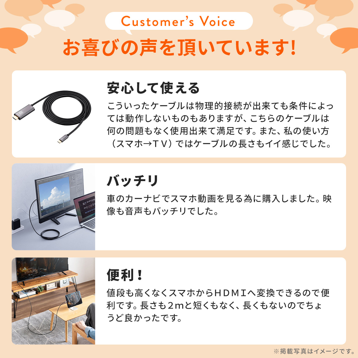 - 商品詳細Type-CポートからHDMIの入力端子を持つ機器に接続できる変換ケーブル。4K/30Hz、フルHD/60Hzの解像度に対応。PD60Wまで対応しているため、スマホなどを充電しながら映像出力が可能。仕様■ケーブル長:約2m■ケーブル外径:約0.45cm■コネクタ形状:USB TypeCコネクタオス - HDMIプラグ(HDMIコネクタオス)+ USB TypeCメスコネクタ※USB TypeCメスコネクタは電力不足時のみ使用します■規格:Displayport ver.1.4■生産地:中国■取扱説明書:日本語取扱説明書あり■保証期間:初期不良のみ対応機種■対応機種:<パソコン>各社パソコン、タブレットPC、スマートホンなど※USB Type-Cポート(Displayport alternate mode対応)を持っている機種に対応します。※Thunderbolt3・Thunderbolt4(USBTypeC)ポートを持っている機種に対応します<ディスプレイ・テレビ>HDMI(HDMIタイプA)入力端子を持つ各社ディスプレイ・テレビ・プロジェクタなど※すべてのUSB Type-C? 搭載機器がDisplayPort Alternateモードに対応しているわけではありません。詳しくは機器の取扱説明書をご確認いただくか、各メーカーにお問合せください。※音声出力対応の機種では、HDMI機器への音声出力ができます。※接続した機器側から音声を出力する場合は、設定が必要な場合があります。詳しくは接続機器の取扱説明書を御確認下さい。※各解像度に対応したケーブルやテレビ、ディスプレイが必要です。※HDRの画像をお楽しみいただくには本製品のほかに、パソコン、ディスプレイ、ケーブル、コンテンツのすべてがHDRに対応している必要があります。※HDRの画像を表示するにはHDRに対応した機器、HDRに対応したディスプレイやテレビが必要です。また、ディスプレイやテレビの設定を行う必要がある場合があります。※HDRの画像を表示するには各OSの設定が必要です。また映像などのコンテンツや再生アプリケーションがHDRに対応している必要があります。(HDRに対応していないコンテンツや、画面を表示した場合、オリジナルの色と異なる表示となるのでその場合にはHDRの表示でなくSDRモードでの表示に変更してください。)※接続する機器のUSB端子からの電力で動作します。電力供給が安定しない機器の場合動作しないまたは、動作が不安定になる場合があります。※HDMI出力のPC、AV機器からUSB Type-Cポート(DisplayPort alternate mode対応)への入力はできません。※環境、機器により、正常に動作しない場合があります。すべての機器での動作を保証するものではありません。【2024年09月登録】関連キーワード:★iphone14plusケーブル・アダプタ★ ★iphone15ケーブル・アダプタ★ ★iphone15plusケーブル・アダプタ★ ★iphone15proケーブル・アダプタ★ ★iphone15promaxケーブル・アダプタ★ ★iphone16ケーブル・アダプタ★ ★iphone16plusケーブル・アダプタ★ ★iphone16proケーブル・アダプタ★ ★iphone16promaxケーブル・アダプタ★ ★ipadpro6ケーブル・アダプタ★ ★ipadpro4ケーブル・アダプタ★ ★ipad10ケーブル・アダプタ★ ★usbchdmi★ ★usbchdmi★ サンワサプライ 4969887771587⇒こちらの商品のレビューを、もっと読みたい方はこちらラインナップ500-KC044購入はこちら500-KC045購入はこちら