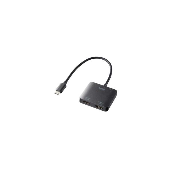 - Type-CポートからHDMI×2ポートに分配/拡張して映像出力ができる4K対応変換アダプタ。PD対応で充電しながらの長時間映像出力が可能。「USB Type-CーHDMI変換アダプタ(2ポート/4K/PD対応)」■USB Type-C搭載(映像出力に対応したType-Cポートのみ)のパソコンから2台のHDMIディスプレイやテレビなどに映像・音声を出力することができる変換アダプタです。■USB Type-C接続でのディスプレイ増設「DisplayPort Alternate Mode」に対応するためソフトウェアのインストールなしで簡単にマルチディスプレイ環境(ミラーモード/拡張モード)を実現できます。■2台のディスプレイへの拡張出力に対応しておりノートパソコンの画面を含めた場合、最大3画面への拡張出力(4K/60Hz×2+ノートPC画面)が可能です。■2台のディスプレイへの複製出力に対応しておりノートパソコンの画面を含めた場合、最大3画面に同じ画面出力(4K/60Hz×2+ノートPC画面)が可能です。■PDアダプタ(パソコンに付属するPD用アダプタなど)接続にも対応しており、本製品経由でパソコン本体に充電することもできます。※100WまでのPDアダプタに対応します。■ケーブル長が20cmのため接続・取り回しが容易にできます。≪ご注意≫※パソコンのType-CポートがDP1.4以上であり、DSCモードに対応している必要があります。DP1.4、DSCモードに対応しない場合、最大画面数への出力ができないことがあります。※全てのディスプレイ、ノートパソコン画面が表示する画面の解像度に対応している必要があります。※Windows OSのみ対応 macOSには非対応です。形状USB-C → HDMI+USB-C映像4K仕様1[対応機種]<対応パソコン>USB-Cコネクタを標準装備しており、DisplayPort Alt mode(DP1.4以上、DSC搭載)に対応しているWindows搭載(DOS/V)パソコン、Apple Macシリーズ、iPad、iPhone※Nintendo Switch非対応<対応出力機器>HDMI入力端子を標準搭載しているテレビ・パソコン用ディスプレイなど仕様2[対応OS]Windows 11/10macOS(Tahoe)26/(Sequoia)15/(Sonoma)14/(Ventura)13/(Monterey)12/(BigSur)11/10.12/10.13/10.14/10.15iPadOS 13/13.4/14/14.5/15/16/17/18/26iOS 17/18/26[USB]インターフェース規格:USB 5Gbps(USB3.2 Gen1/3.1 Gen1/3.0)準拠コネクタ形状(PC接続側):USB-C電源:セルフパワー・バスパワー両対応仕様3[映像出力ポート]ポート形状:HDMIタイプA(19pin)メス×2最大対応解像度:4K/60Hz対応解像度: 最大4K/60Hz×1(1台接続時) 最大4K/60Hz×2(2台同時接続時) ※パソコン、プロジェクターやディスプレイ、接続ケーブルなどが同じ解像度に対応している必要があります。HDR対応:対応HDCP:HDCP1.4、HDCP2.2、HDCP2.3Type-CポートからHDMI×2ポートに分配/拡張して映像出力ができる4K対応変換アダプタ。PD対応で充電しながらの長時間映像出力が可能。「USB Type-CーHDMI変換アダプタ(2ポート/4K/PD対応)」