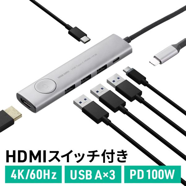 ドッキングステーション USB Type-C 画面ON/OFF スイッチ付き HDMI 4K/60Hz USB PD100W対応 USB 5Gbps ケーブル一体型 持ち運び 400-HUBCP30GM