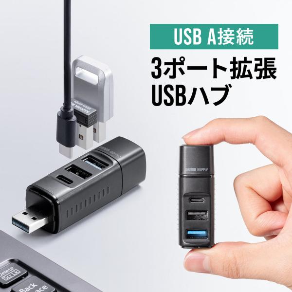 USBハブ コンパクト 小型 USB-A接続 USB3.0 USB2.0 バスパワー USB-Cポート USB Aポート 3ポート コンボハブ 黒色 軽量 400-HUBA39BK