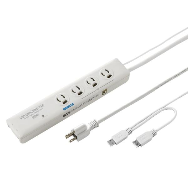 - 高性能雷ガードにUSB連動機能を追加した便利なタップ。3P抜け止め。※箱にキズ、汚れがありますが商品は新品です。<特長>●USB電流感知式USBケーブルをパソコンのUSBポートに差し込むだけで、パソコン本体に流れる電流をキャッチし、パソコン本体のON・OFFに連動して連動口に差した周辺機器への通電もON・OFFします。(パソコン口×1、連動口×4、非連動口×2)※USB1.1、2.0規格準拠。※USB電源消費電流500μA以下。●パソコンのON・OFFに連動しない常時通電差込口を2個装備しています。●コンセントにパソコン、ADSLモデムなどの電源を差し込み、モジュラーコードを接続するだけで独自設計のバイパス回路により雷サージをアースへ逃がし、接続機器をガードすることができます。●電源(AC)雷ガード内蔵されたサージ吸収素子(バリスタ)が雷サージを吸収し、接続された機器を守ります。●電話回線(TEL)雷ガード電話回線用に高性能アレスタ(避雷器)を内蔵しています。電話機、ADSLモデムを雷からガードできます。 (アナログ、ISDN、ADSL対応)●雷ガード作動確認ランプ雷ガード機能が正常に作動時点灯します。●トラッキング火災予防プラグプラグの刃の根元にトラッキング火災予防に極めて有効な絶縁キャップが付いています。●抜け止めコンセントプラグをロックできるコンセント採用しています。●アース端子付きアース線が接続できる端子付きです。●マグネット付きスチール机に簡単に取付けできるマグネット付きです。●電話回線接続用モジュラーコード(1.5m)が1本付属しています。●プラグには、トラッキング火災予防に有効な絶縁キャップが付属しています。●内蔵されたサージ吸収素子(バリスタ)が雷サージを吸収し、接続された機器を守ります。<電線から侵入してくる誘導雷を防ぐ雷ガードの仕組み>電線から侵入してきた誘導雷(1)が、モジュラーコンセントや電源コンセント(2)などを伝って、ブロードバンドタップに侵入。タップに内蔵されたサージ吸収素子(バリスタ・アレスタ)(3)が雷サージを吸収、アースを伝わって、雷サージを外へ追い出します。<大気中から侵入してくる侵入雷を防ぐ雷ガ−ドの仕組み>大気中から侵入してきた侵入雷(4)をADSLモデムなどに接続されたアースコード(5)を伝って、ブロードバンドタップに侵入。タップ内部のバイパス回路からアースコード(6)を伝わって雷サージを外に追い出します。<接続方法>1.パソコンの電源がOFFの状態になっていることをご確認ください。2.本製品のUSBプラグをパソコンのUSBポートに差し込みます。3.既にUSB機器がある場合は本製品のUSB分岐ソケットに接続します。4.本製品の電源プラグをコンセントに差し込みます。5.周辺機器の電源スイッチをONにした状態で周辺機器の電源プラグを本製品の差込口に差し込みます。6.接続機器の容量が1500W(15A)以下であることをご確認ください。<動作方法>1.パソコンの電源をONにします。OAタップに通電されると周辺機器の電源がONになります。USBハブを介して接続されている場合はパソコンがUSBハブを認識してから周辺機器の電源がONになります。2.パソコンを終了させ電源をOFFにします。数秒後に周辺機器の電源がOFFになります。※本製品は通常のタップとしてはご使用できません。USBポートから電源信号を感知しないとコンセントは通電されません。本製品はパソコン向けに開発された製品です。その他の用途にはご使用になれません。<仕様>■定格容量:15A・125V(合計1500Wまで)■プラグ仕様:3P(絶縁キャップ付き)■差込口:3P・4個口(パソコン本体用×1、連動口×3)■差込口形状:抜け止めタイプ■電源コード長:2m■USBコード長:1m■付属品:モジュラーコード(1.5m)■本体サイズ:W260×D50×H34mm<雷サージ耐量及び使用部品>■サージ吸収素子:バリスタ(電源部)、アレスタ(電話回線部)■直流制限電圧:470V/1mA(電源部)、230V/(100V/s) (電話回線部)■サージ耐量:5500A(電源部)、10000A(電話回線部)メーカー欠品等により、1週間以上の納期がかかる場合メールにてご連絡いたします。<関連キーワード>TAP-RE9SPUN サンワサプライ 4969887830277
