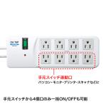 - 雷ガード内蔵、一括集中スイッチ&ブレーカー付きタップ。3P・8個口■一括集中スイッチ付きで、接続した機器の電源をまとめてON・OFFできます。■手元スイッチ連動口に接続した4個の機器の電源を、まとめてON・OFFできる手元スイッチ付きです。※8個口の内、4個口は常時通電となります。■雷ガードを内蔵しており、恐ろしい雷から機器をガードします。雷ガード作動中確認ランプ付きです。■ブレーカー内蔵で電力オーバーによる発熱や火災事故を防ぎます。接続している機器の消費電力の合計が1500Wを超えた場合、ブレーカーが作動し電源が切れます。<ご注意>※消費電力が1500Wを超えても、すぐに電源は切れません。オーバーした消費電力の%によって、ブレーカーが作動するまでの時間は異なります。・135%電力オーバー時(2025W)/約1時間・200%電力オーバー時(3000W)/約4〜50秒・300%電力オーバー時(4500W)/約0.8〜12秒・500%電力オーバー時(7500W)/約0.3〜4秒※室温25℃の場合。 <ブレーカーが作動した場合>※一度接続した機器をタップから外し、1500W以下になるように機器を取り除き、リセットボタンを押してください。■トラッキング対策適用範囲拡大対応しています。(耐トラッキング性試験、グローワイヤ燃焼性試験認可)■スチール机に仮固定できるマグネット付きです。■壁などに仮固定できるフック穴付きです。■PSE(電気用品安全法)技術基準適合品です。 サンワサプライ雷ガードタップ (TAPSP307)