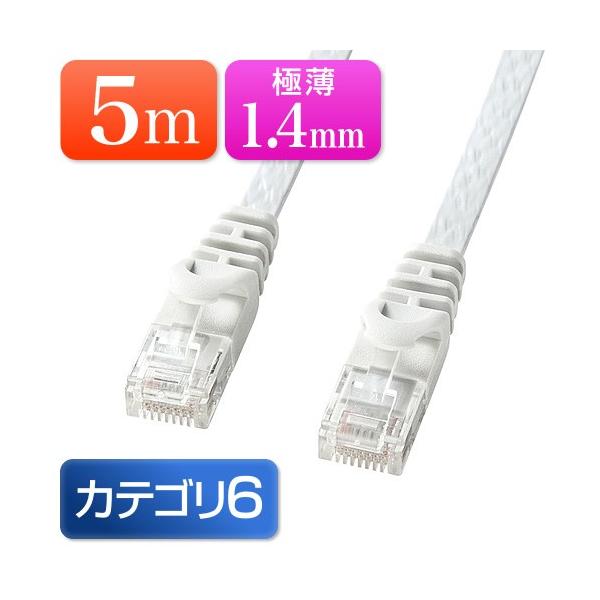 薄さ1.4mmの超フラットタイプのカテゴリ6LANケーブル。カーペットの下や細い隙間の配線に最適。5m・ホワイト。