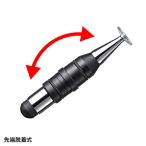 - 先端部分が脱着でき、シリコンゴム・ディスクタイプどちらでも使用できます。 シリコンゴムで滑らかな操作が可能です。 ディスクタイプで、ペン先が見えやすく、細かい操作ができます。 ※約50度まで傾けて使用可能です。 タブレット、スマートフォンなどの快適な操作が可能です。 タブレット・スマートフォンなどの静電容量方式、電子辞書などの感圧式両方に対応しています。 胸ポケットなどに差せるクリップ付き、ストラップホール付きです。 サンワサプライ製液晶保護フィルムを貼った状態でも操作可能です。 ※貼っていない状態よりは反応が鈍くなる場合があります。 長さ/約128mm(シリコンゴム使用時)、約133.5mm(ディスクタイプ使用時) 本体直径/8.5mm(突起部除く)、12.6mm(クリップ部含む) 先端部直径/6mm(シリコンゴム)、7.5mm(ディスクタイプ) 材質 本体/真鍮 クリップ/ PC(ポリカーボネート) 先端/ 導電性シリコンゴム、PC(ポリカーボネート) 先端内側 シリコン側/ 銅 先端内側 PC側/ 鉄と銅 先端中央/ 導電性PC 対応機種 静電容量方式、感圧式、光学式タッチパネルを持つ機種 (各社スマートフォン、タブレット、電子書籍、ブックリーダー、eBookなど) Apple iPadシリーズ・iPhoneシリーズ ※機種により、タッチペンの反応が悪い場合があります。ご了承ください。 JANコード:4969887897690