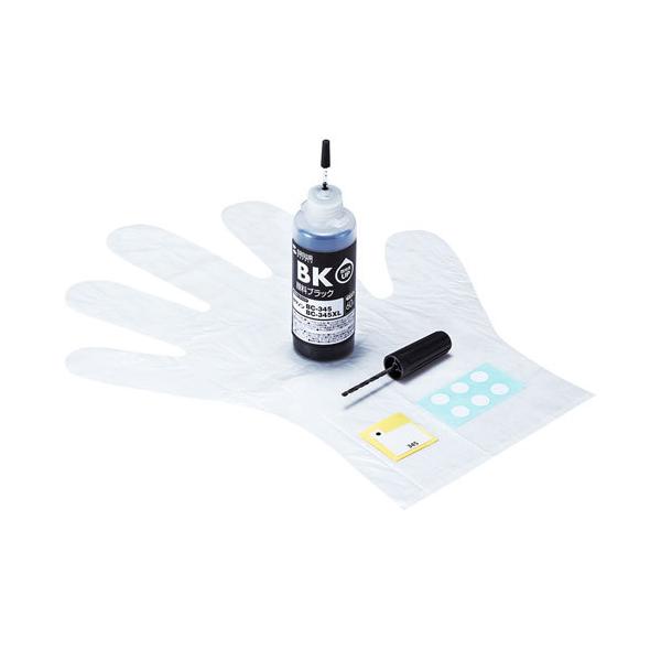 - キヤノン BC-345(ブラック)約10回・BC-345XL約5回。※箱にキズ、汚れがありますが商品は新品です。<特長>●キヤノン用つめかえインクです。●BC-345/BC-345XL対応つめかえインクです。●初めての人の工具付きセットです。<仕様>■インクボトル:顔料ブラック(60ml) ■詰め替え回数:BC-345/約10回分BC-345XL/約5回分■セット内容:手袋×1組、ドリル×1個、ドリルガイドシール×1枚、注入口シール×12枚、取扱説明書■メーカー保証:なし■対応プリンター:キヤノン PIXUS TS3130/TS203/TS3130S/TR4530 ※残量検知機能は無効になります。■対応カートリッジ:キヤノン BC-345・BC-345XL<ご注意>※詰め替え回数はあくまでも目安です。カートリッジの状況により若干異なります。※詰め替え回数は純正インクと同等の印字枚数を保障するものではありません。※残量検知機能は無効になるとインク残量が表示されませんのでインクがなくなった場合でもプリンターからメッセージが表示されません。インクの詰め替えは早めにすることをお勧めします。※新しく純正カートリッジを使用すると残量検知機能は有効に戻ります。※他社詰め替えインクやサンワサプライマルチシリーズと混ぜて使用することはできません。※再生インクカートリッジや互換カートリッジには対応していません。<関連キーワード>4969887897874 キヤノン BC-345 詰め替えインク 5回分 ブラック