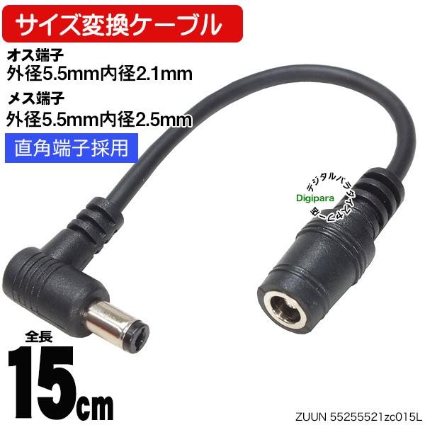 外径5.5mm内径2.5mm(メス)→外径5.5mm内径2.1mm(オス)変換ケーブル 15cm オス端子L型 DCアダプタサイズ変更 電力供給 充電等 ZUUN 55255521zC015L Z01638