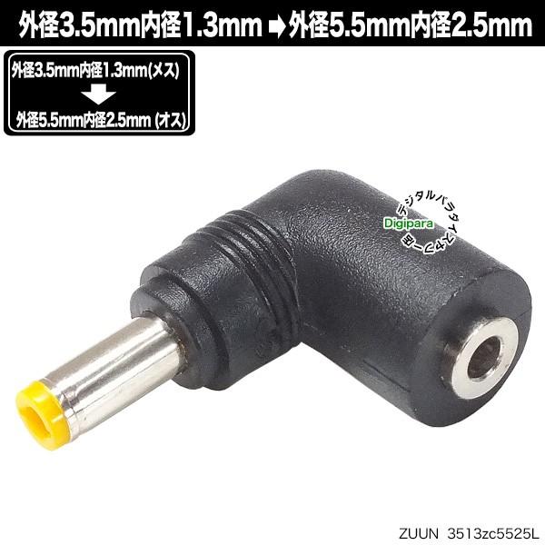 外径3.5.mm内径1.3mm(メス)→外径5.5mm内径2.5mm(オス)直角DC変換 DC端子中継 サイズ変換 充電や電力供給 ZUUN 3513zc5525L