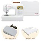 付属品:ジクザグ押え(ミシン本体に付属)、ファスナー押え、ボタンホール押え、ボタンつけ押え、縁かがり押え、ブラインドステッチ押え、サテン押え、ボビン3個、ドライバー、ドライバー小、ブラシ付リッパー、針パック、シームガイド、糸コマ押え(大・小)、付属糸立て棒、糸こま座、ハードケース、ワイドテーブル(メジャー付)、電源コード、フットコントローラー、取扱説明書、説明DVD、保証書