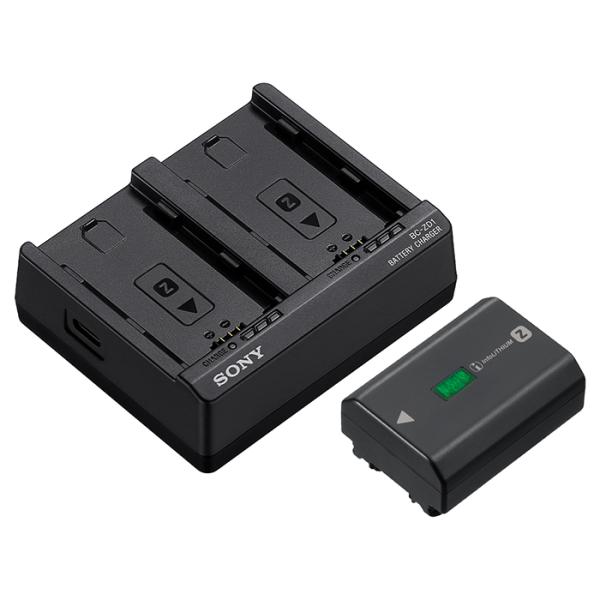 - バッテリーチャージャー「BC-ZD1」と、リチャージャブルバッテリーパック「NP-FZ100」のキットです。「BC-ZD1」は「NP-FZ100」2個を同時に急速充電可能。バッテリーを予備で持つことで、撮影中のバッテリー切れにも安心です。